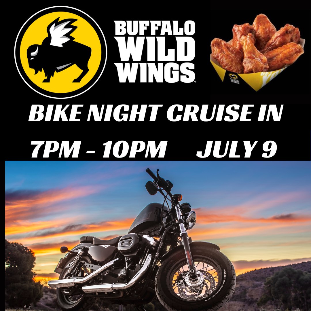 Join us Saturday, July 9th at Buffalo Wild Wings from 7PM – 10PM for a Bike Night Cruise In.