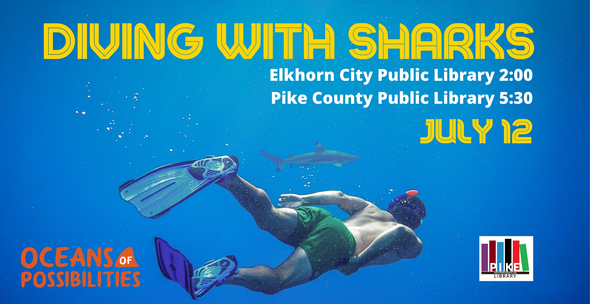 Dr. Julie Ann Reizner, a professor studying and teaching Dinosaur Paleontology, Cave Geology, and Historical Geology at Northern Kentucky University, will visit the library to discuss her experiences diving with sharks and bring shark artifacts and scuba equipment for kids to see and touch!