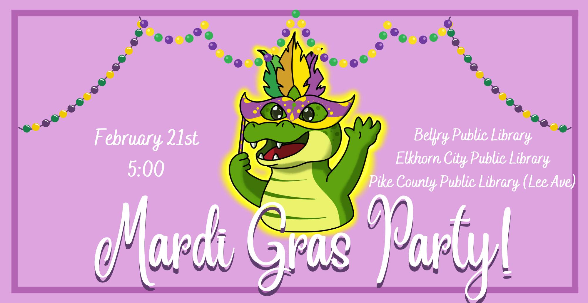 Learn about Mardi Gras with crafts and games at the Mardi Gras Party! For ages 12 and under. This program will be held at the Pike County Public Library (Lee Avenue), Elkhorn City Public Library, and Belfry Public Library on February 21 at 5:00. No registration is required.