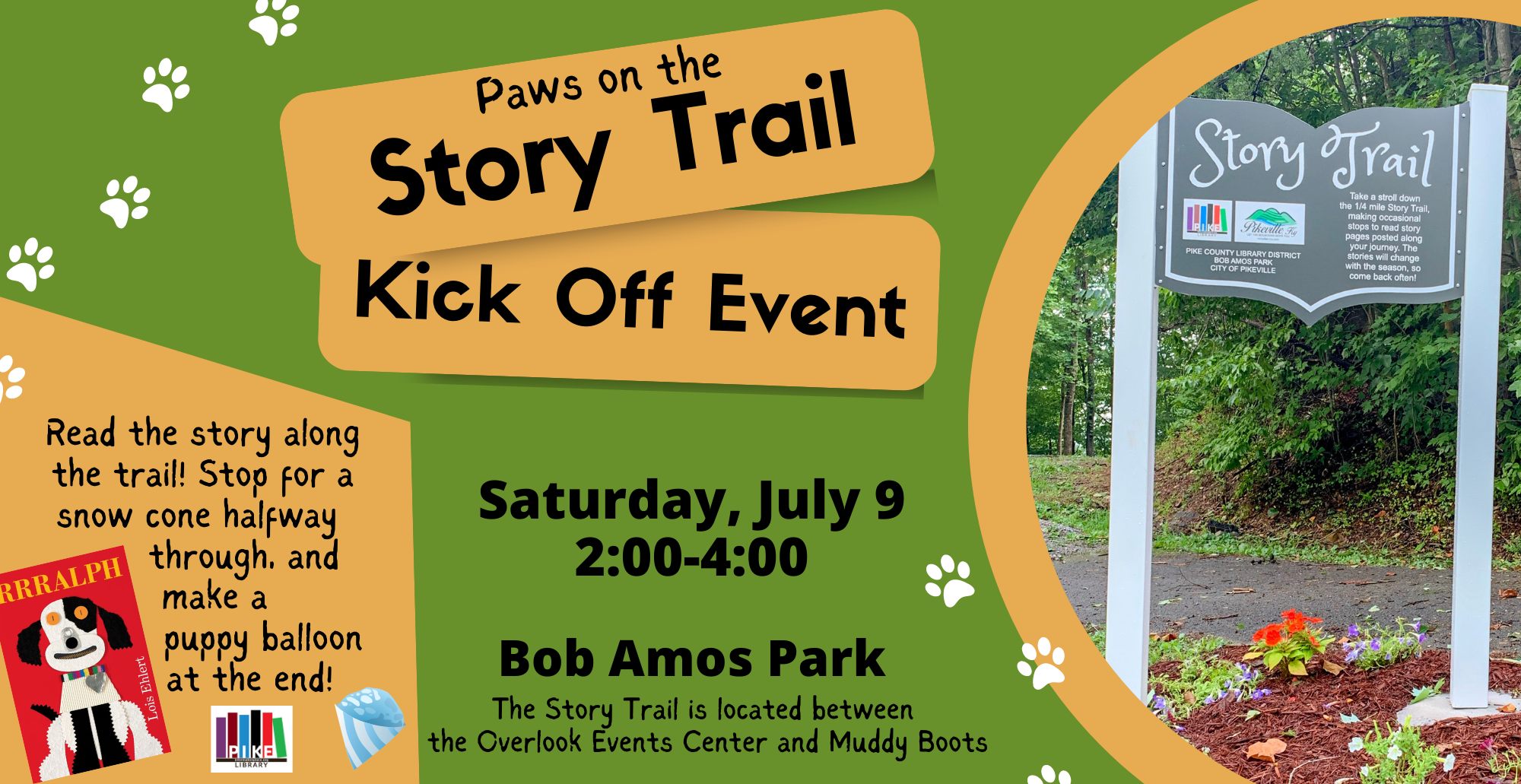 Have a DOGgone good time at the Story Trail kick off event, Paws on the Story Trail, on Saturday, July 9 from 2-4!