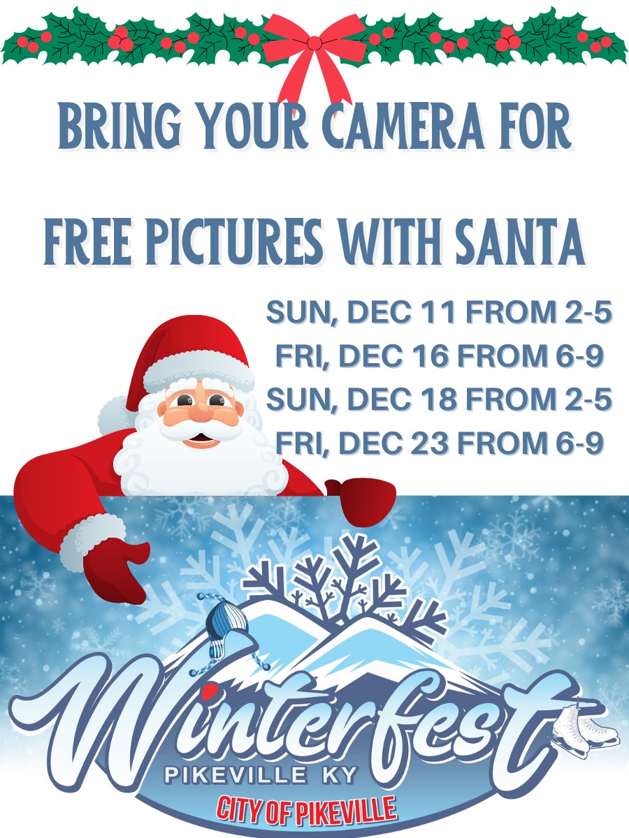 Santa will stop by the City of Pikeville’s Winterfest several days in December. Be sure to bring your camera for a free photo!