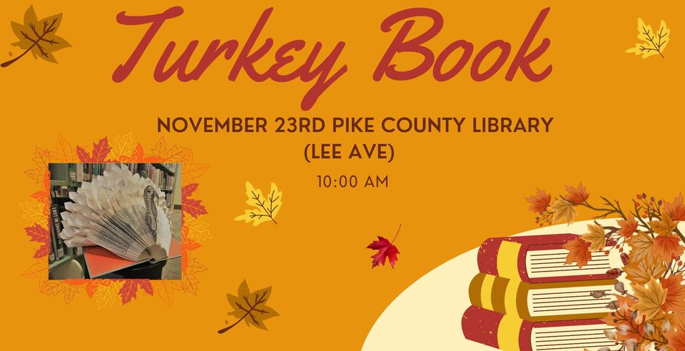 Turn an old book into a turkey! This free craft program will be held Wednesday, November 23 at 10:00 at the Pike County Public Library (Lee Avenue). No registration is required.