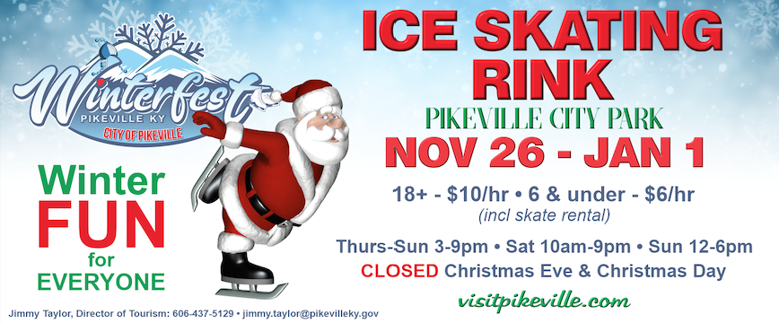 The whole family will enjoy Winterfest Ice Skating in beautiful Downtown Pikeville! City Park will be transformed into a magical Winter Wonderland where everyone can feel like a kid again! Throughout the Season, skating hours are Thursday & Friday 3pm to 9pm, Saturdays 10am-9pm and Sundays from Noon-6pm. Adults $ 10.00 and Children 6 and under $ 6.00.