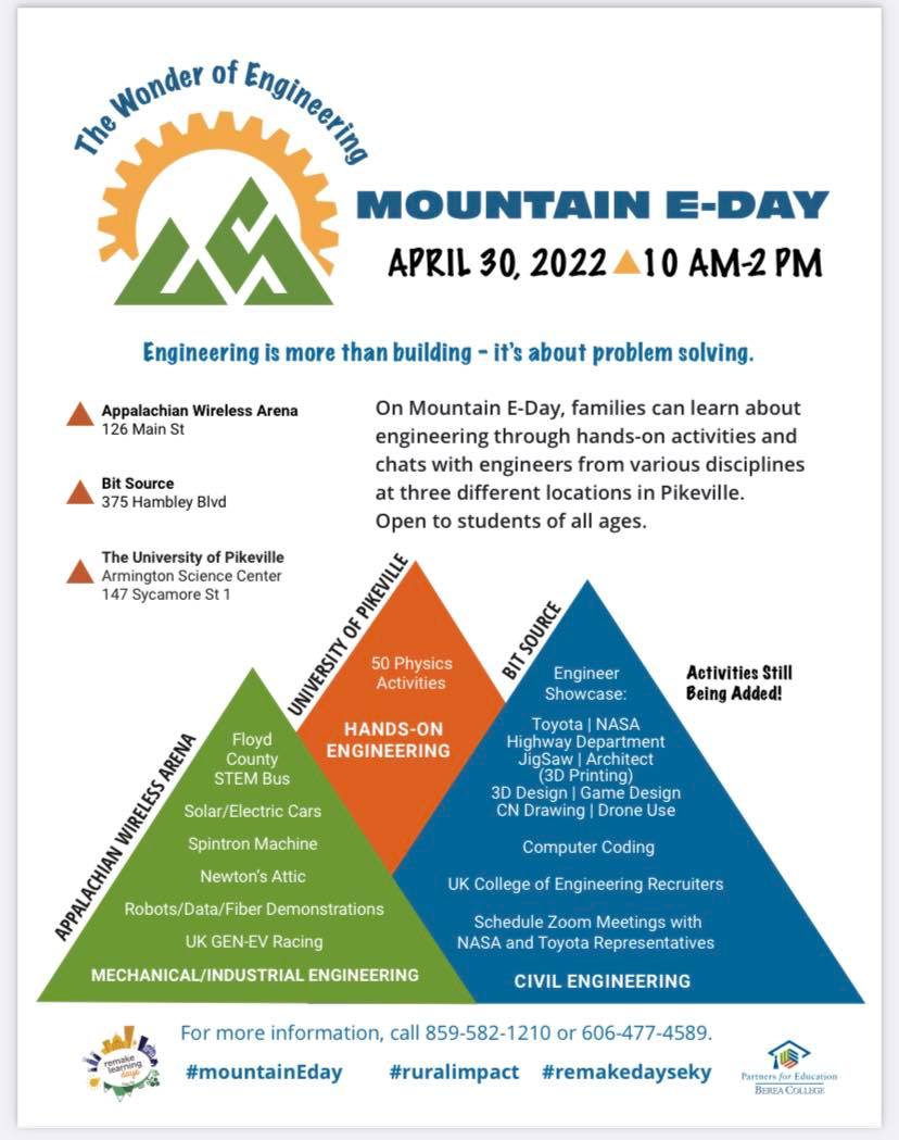 On Mountain E-Day, families can learn about engineering through hands-on activities and chats with engineers from various disciplines at three Pikeville locations, Appalachian Wireless Arena, Bit Source, and The University of Pikeville. Mountain E-Day is open to students of all ages! #mountainEday #ruralimpact #remakedayseky #remakedays