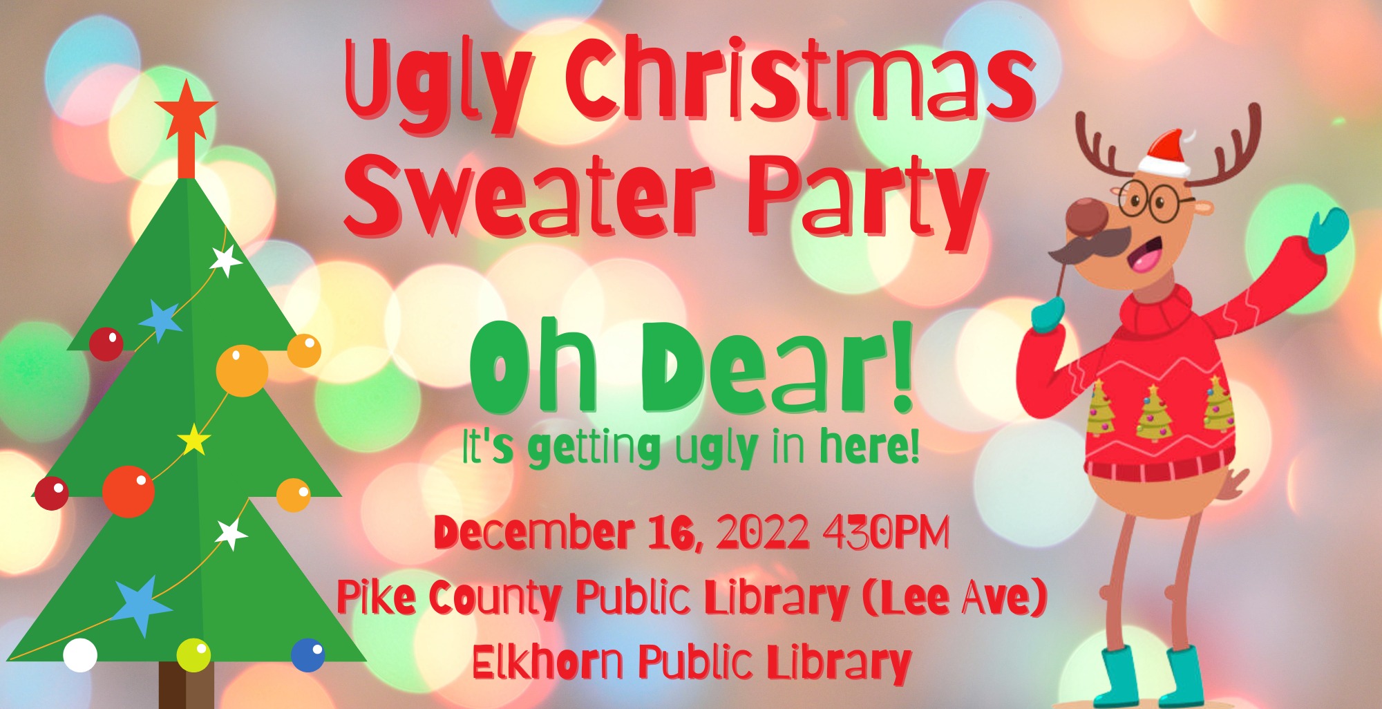 Wear an ugly Christmas sweater to decorate an ugly sweater cookie, and/or make a paper ugly Christmas sweater! This kid-friendly program will be held at both the Pike County Public Library (Lee Avenue) and Elkhorn City Public Library on December 16th at 4:30. No registration is required.