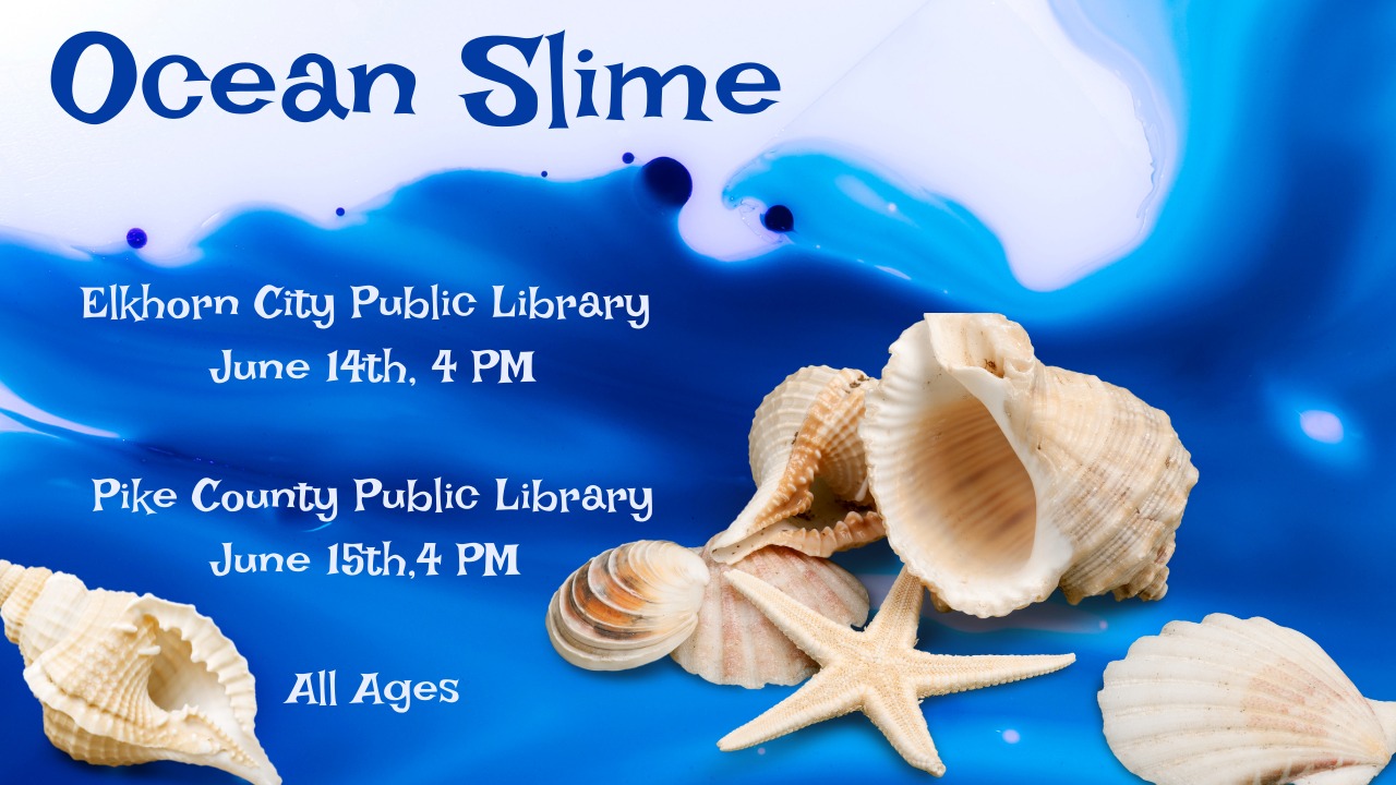Make some ocean-inspired slime at this Summer Reading Program event! Ocean Slime will be held at the Elkhorn City Public Library on June 14 at 4:00 and at the Pike County Public Library (Lee Ave) on June 15 at 4:00