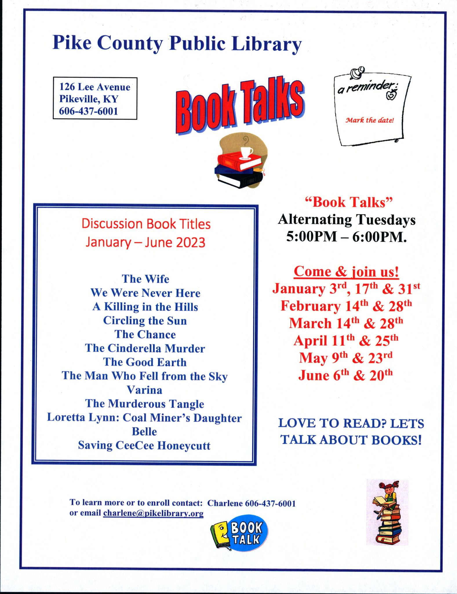 The Book Talks book club meets alternating Tuesdays at 5:00 at the Pike County Public Library (Lee Avenue). Join us in the new year on January 3rd!