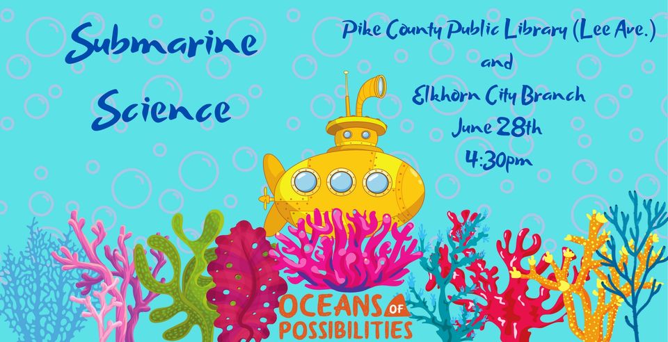 Make a submarine and see if it floats! Then take a virtual submarine tour. This program will be held at both the Pike County Public Library (Lee Ave) and Elkhorn City Public Library on June 28 at 4:30.
