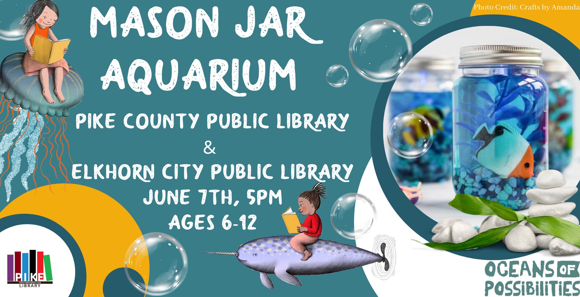 Craft an aquarium in a mason jar at the Summer Reading Program on June 7th at 5:00 at the Pike County Public Library (Lee Ave) and Elkhorn City Public Library. Recommended for ages 6-12.