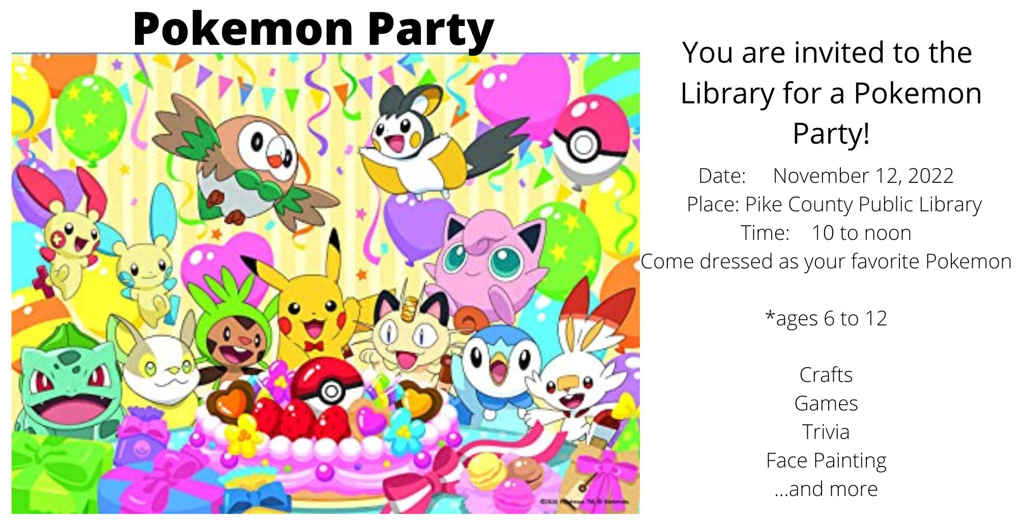 Dress as your favorite Pokemon character and attend the Pokemon Party on Saturday, November 12 from 10-12 at the Pike County Public Library (Lee Avenue) for crafts and games!