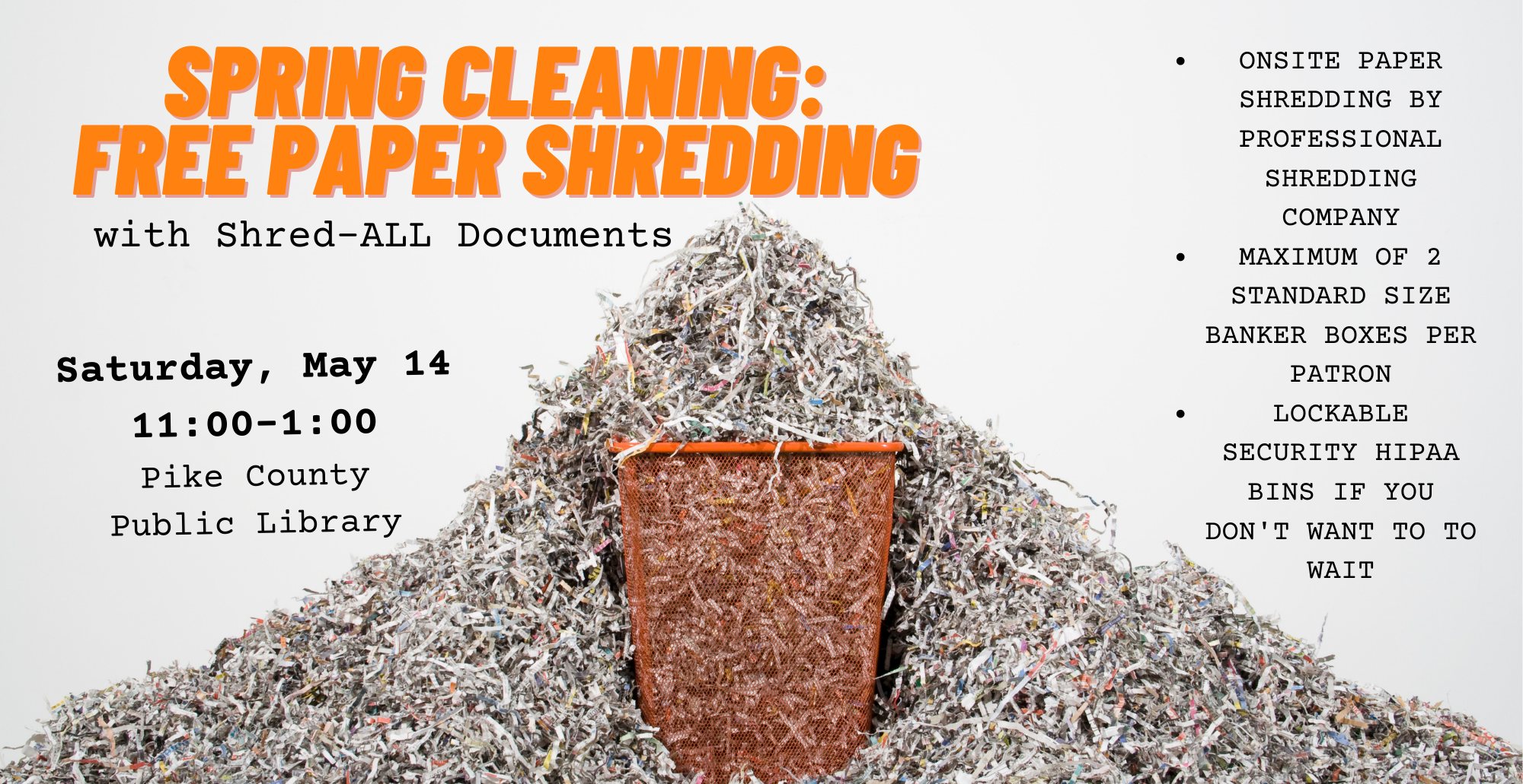 Do some Spring Cleaning and protect your personal information with paper shredding by Shred-ALL Documents, a professional shredding company. The Shred-ALL truck will be located in the Pike County Public Library (Lee Ave) parking lot on Saturday, May 14 from 11:00-1:00 for onsite shredding of a maximum of 2 standard size banker boxes per patron. […]