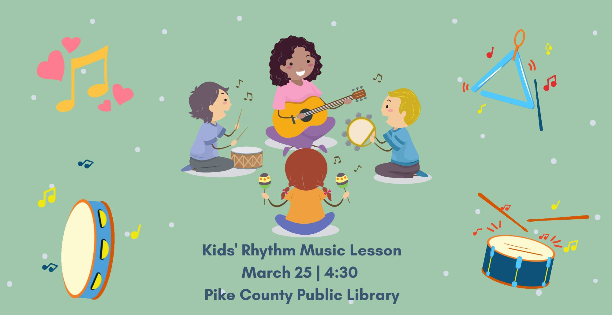 Pike County Public Library 126 Lee Avenue, Pikeville, KY, United StatesUsing various rhythm instruments, we will explore and create rhythms. We will participate in such rhythm activities as: say & play, rhythm repeat, improvisation, as well as singing and playing while accompanied by banjo. Kids’ Rhythm Music Lesson will be held at the Pike County Public Library on Friday, March 25 at 4:30.
