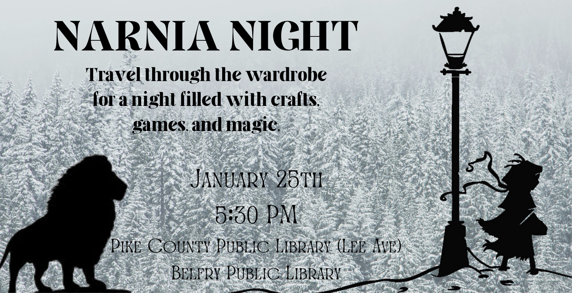 Celebrate C.S. Lewis’ Chronicles of Narnia at the Pike County Public Library (Lee Avenue) and Belfry Public Library on January 25 at 5:30 with crafts, games, and a movie!