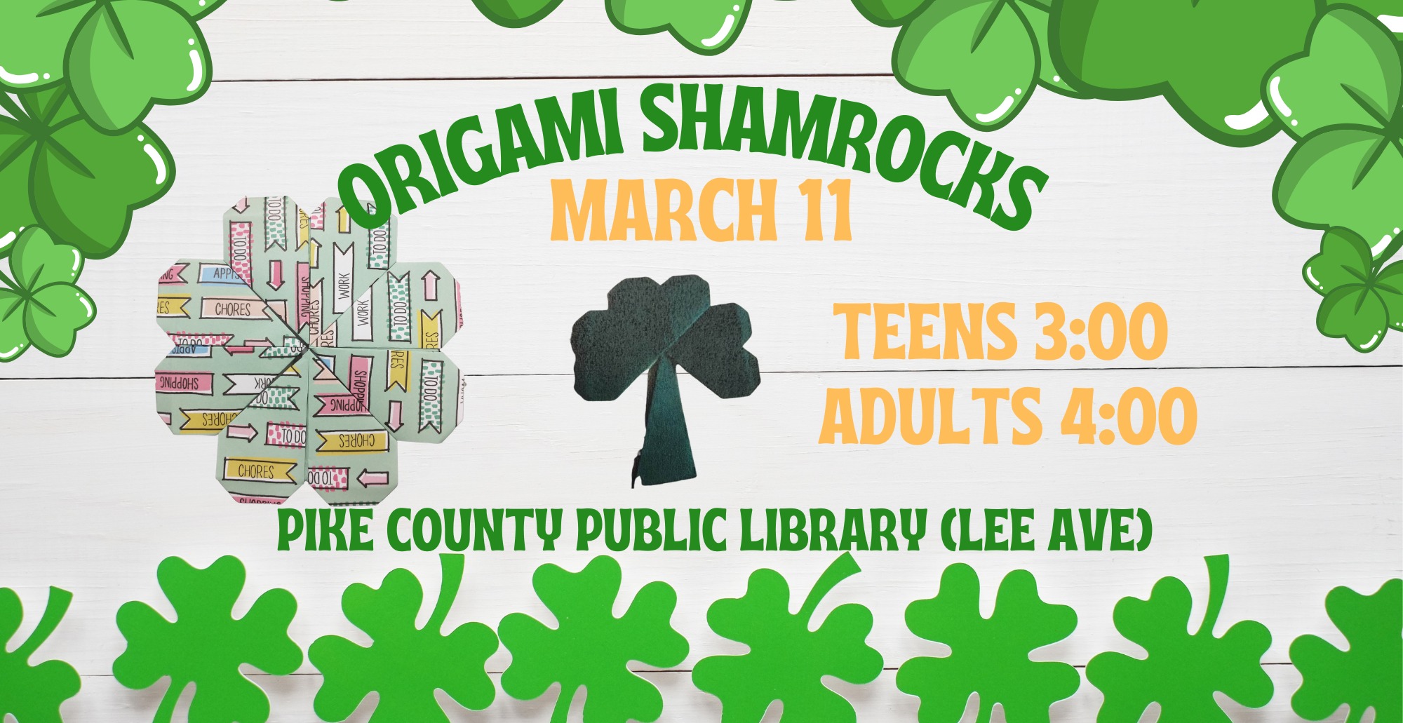 Fold origami shamrocks and four leaf clovers for St. Patrick’s Day at the Pike County Public Library (Lee Avenue) on Saturday, March 11th. A session for teens will be held at 3:00 and a session for adults will be held at 4:00. Both sessions will be in the Teen Room on the second flood of […]