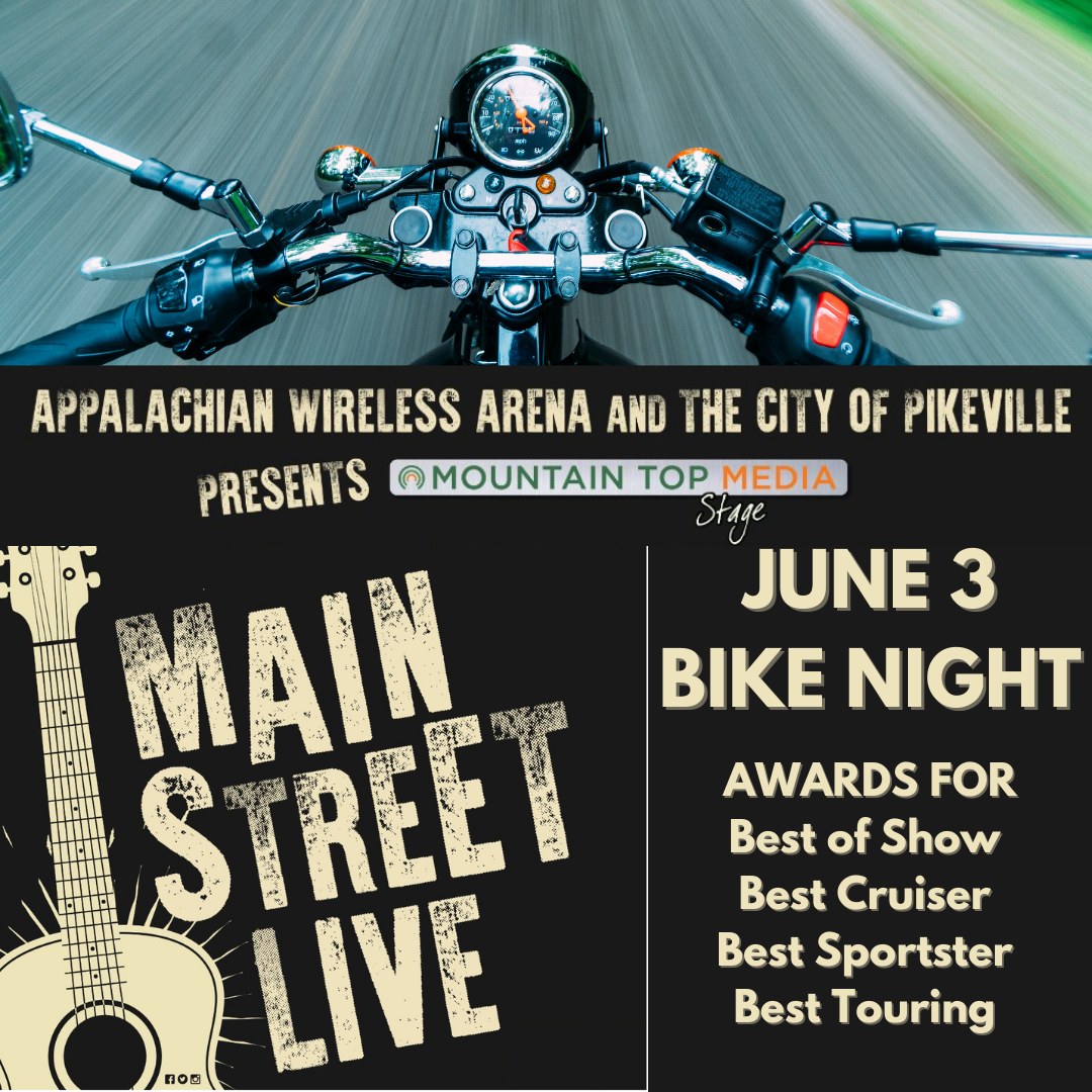 This Friday Night! Bike Night at Main Street Live at the Mountain Top Media Stage at the Appalachian Wireless Arena. Prizes for Best of Show, Best Cruiser, Best Sportster, & Best Touring. #visitpikeville #appalachianwirelessarena #mountaintopmediastage #mainstreetlive